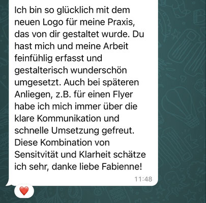 «Für mich war es ein Glückstreffer dass sich die Wege von Fabienne und mir gefunden habe. Fabienne hat meine Wünsche, Ideen usw. toll umgesetzt und ich bin mit meiner Seite inkl. meinem Logo und der Gestaltung der Visitenkarten sehr happy. Fabienne arbeitet sehr zuverlässig und gibt auch Tipps wenn "Frau" mal eine "komische" Idee hat :-). Ich kann Fabienne sehr empfehlen. Von Herzen danke dass es Dich gibt, Liebe Grüsse, Daniela.»