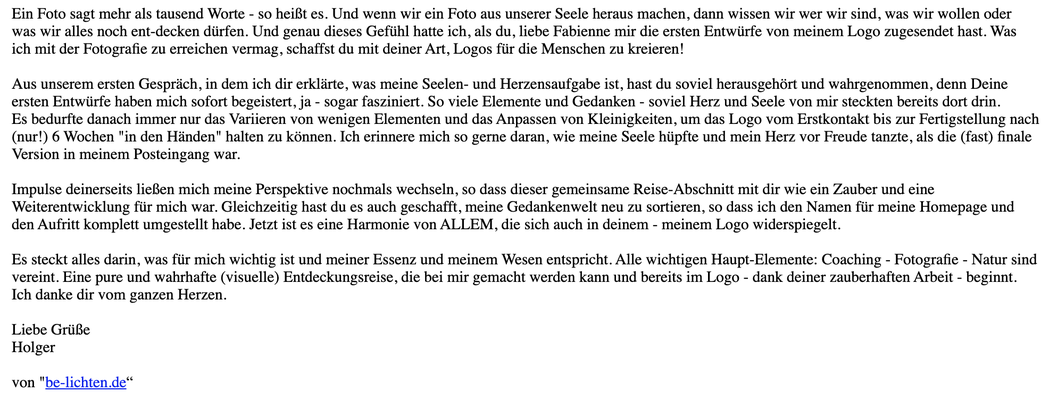 «Es war für mich eine Freude mit Fabienne die Webseite zu gestalten. Sie nahm wahr was mir wichtig ist und mir am Herzen liegt. Diese Eckdaten verband sie auf magische Weise mit Leichtigkeit und heraus kam eine wundervolle harmonische Essenz von allem. Für mich eine gelungene Webseite, welche eine Geschichte erzählt. Wie eine Reise durch mein Leben, mein Märchen. Ein Teil von mir welcher im Verborgenen lag und sichtbar wurde. Danke! Von Herzen empfehle ich Fabienne weiter.»
